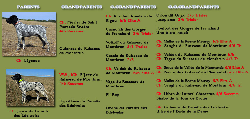 Khyannes Jeanne d'Arc 'Elysée' (Ch. Légende - Ch. Joyce du Paradis des Edelweiss) DOB: 10.10.2022, Braque d'Auvergne female Height at the withers: 56cm Health: HD A/A ED 0:0 OCD free Pat 0/0 Exams: Hunting Ability Exam (KV) - 108/108 points - I. prize Shows: HUNGARIAN CHAMPION SERBIAN CHAMPION SERBIAN GRAND CHAMPION 8x CAC, 3x CACIB, 2x BOS, 6x BOB |