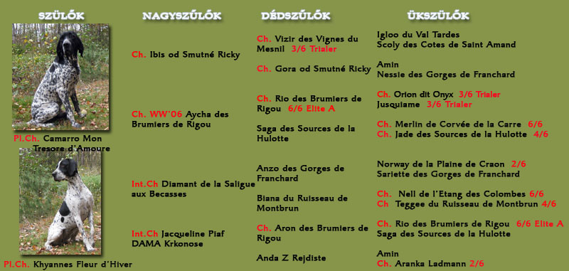 ICh. Alma Ranczo Mysliwego "Alma" (Pl. Ch. Camarro Mon Tresore d'Amoure - Pl.Ch. Khyannes Fleur d'Hiver) Született: 2012.12.27., Braque d'Auvergne szuka Tenyésztő: Marian Surma (Lengyelország)